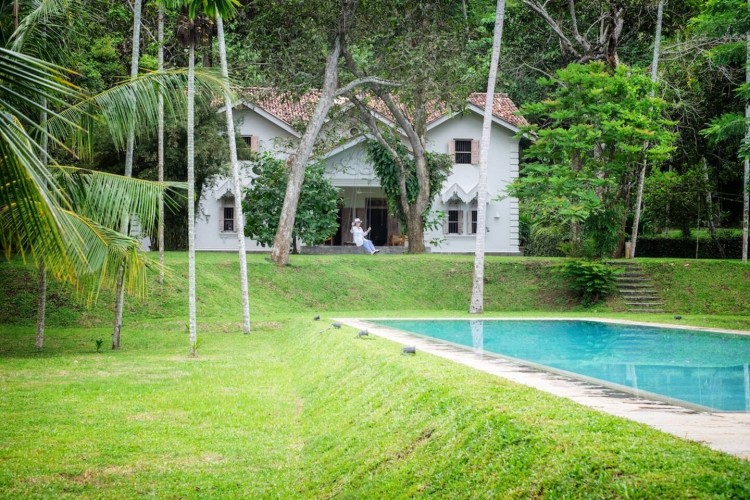 Siri Wedamadura Villa has four bedrooms designed with minimal décor. Instead, each room encapsulates the beauty of its surroundings. The reflective shades and tones facilitate the whites and neutrals shades to create a soft meditative feel. One bedroom features a double bed whilst the other bedrooms are furnished with single beds. Each bed has its own mosquito net for a comfortable, undisturbed sleep. Likewise, the antique armoires easily accommodate your belongings. The windows offer views of paradise in the tropical gardens. Likewise, accompanying the bedrooms are en-suite bathrooms with polished walls, large windows, a shower area and other amenities. Through traditional doors, one can head to the living room at the villa which boasts high soaring ceilings, a sunroof through which streams in abundant natural light, and vintage interiors. Furthermore, there is vinyl lattice furniture which will take you back in time, floor lamps, and artwork adorning the walls. Finally, the weathered and washed-off look on the ceiling completes this antique and unique room. You will find bookshelves for you to enjoy bestselling titles, games like carrom which is a South Asian board game and other relaxing activities to engage in.The Garden and Pool